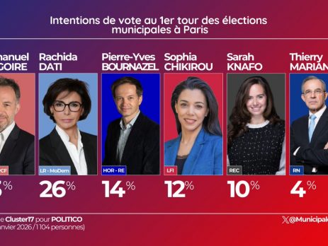 🗳️ Intentions de vote à Paris - @Cluster_17 • E. Grégoire (PS-LÉ-PCF) - 33%• R. Dati (LR-MoDem) - 26%• P-Y. Bournazel (HOR-RE) - 14%• S. Chikirou (LFI) - 12%• S. Knafo (REC) - 10%• T. Mariani (RN) - 4%#Municipales2026 pic.twitter.com/H4d7gNhy9n — Municipales 2026 (@Municipales26_) February 2, 2026