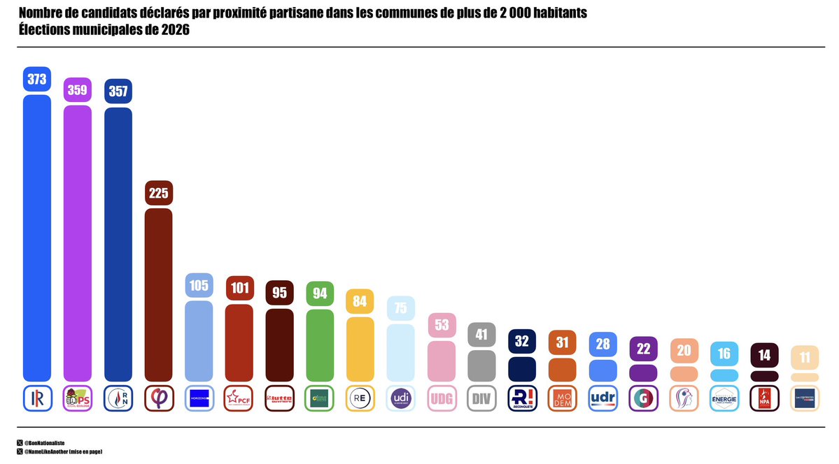 357 candidatures déclarées pour le #Rn? C’est peu. À comparer à 350 listes déposées par le FN en 1989 (!) et 520 en 1995.Hugo Boulitz ☃️ (@BonNationaliste)MUNICIPALES 2026 : candidatures déclarées dans toutes les communes* de +2000 habitants, mi-janvier 2026 :