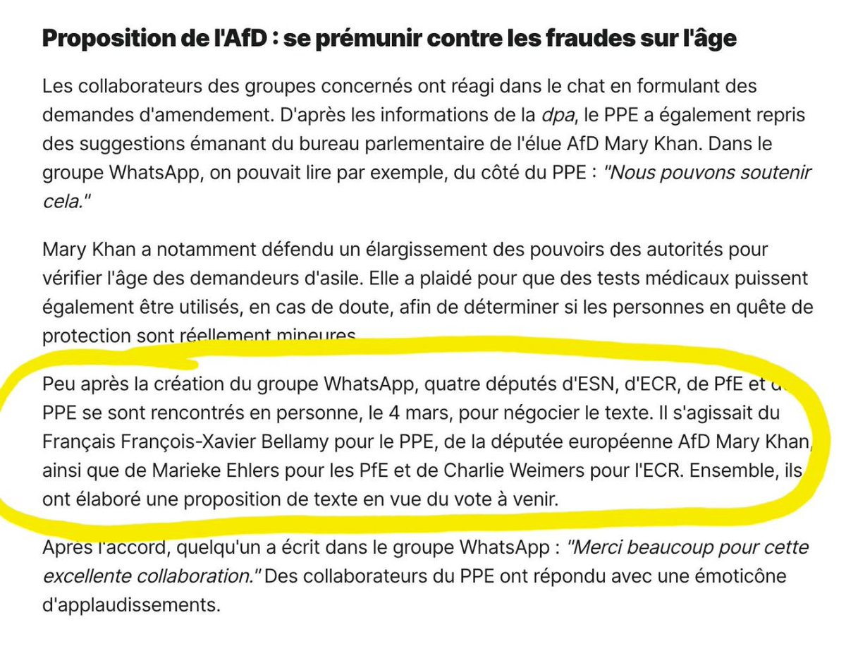 Il faut arrêter avec les mensonges!Leïla Chaibi (@leilachaibi)Bombe révélée par @euronews : François-Xavier Bellamy collaborerait avec l’AFD sur la politique migratoire européenne.Le parti allemand néonazi qui prône la déportation massive de millions de personnes. Le parti où des élus nient la Shoah.
