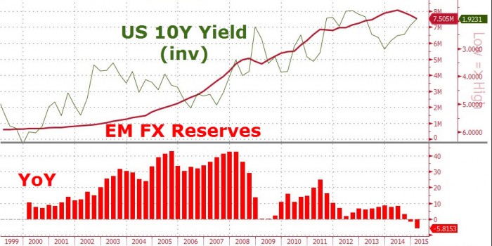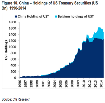 Nous avons suivi ce dossier jusqu’à cette semaine en notant qu’en vertu du nouveau régime FX (entre le dollar et le yuan) la Chine a probablement vendu environ 100 milliards de dollars de treasuries rien que durant les 2 dernières semaines afin de stabiliser le yuan. Pour dire les choses simplement, dans le cadre de la dévaluation du yuan et les efforts qui ont suivi afin de contenir ladite dévaluation, la Chine a effectué une purge épique dans ses obligations américaines.