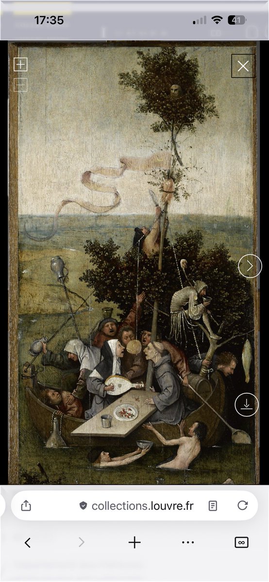 « LA NEF DES FOUS » de Jérôme Bosh. Rare allégorie des 2 chambres réunies du Conseil d’Etat ouvrant tous les droits aux soins aux étrangers extra Européens titulaires du droit d’asile dans l’un quelconque des pays de l’UE. C’est la déraison arithmétique!