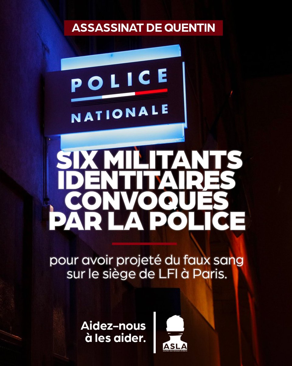 @ASLA_asso @LNatifsASLA (@ASLA_asso)🔴 Six militants identitaires parisiens du groupe Les Natifs sont convoqués par la sûreté territoriale de Paris à la suite d’une action symbolique contre le siège de La France Insoumise. Ils sont convoqués car on les suspecte d’avoir projeté du faux sang sur la façade en réponse à l’assassinat de Quentin Deranque.👉Cette action visait à dénoncer les liens entre LFI et la Jeune Garde, groupuscule d’extrême gauche impliqué dans les violences ayant conduit à la mort de Quentin, 23 ans, à Lyon.