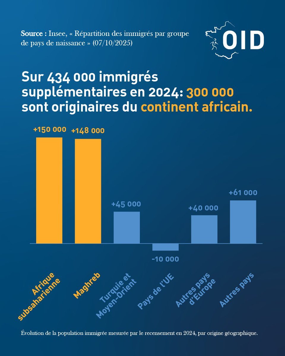 RT by @jylgallou: 🌍 434 000 immigrés supplémentaires en France en 2024 : une composition presqu’exclusivement extra-européenne. Environ 300 000 sont originaires du continent africain (150 000 Afrique subsaharienne + 148 000 Maghreb) 📉 La population originaire de l’UE est en recul. pic.