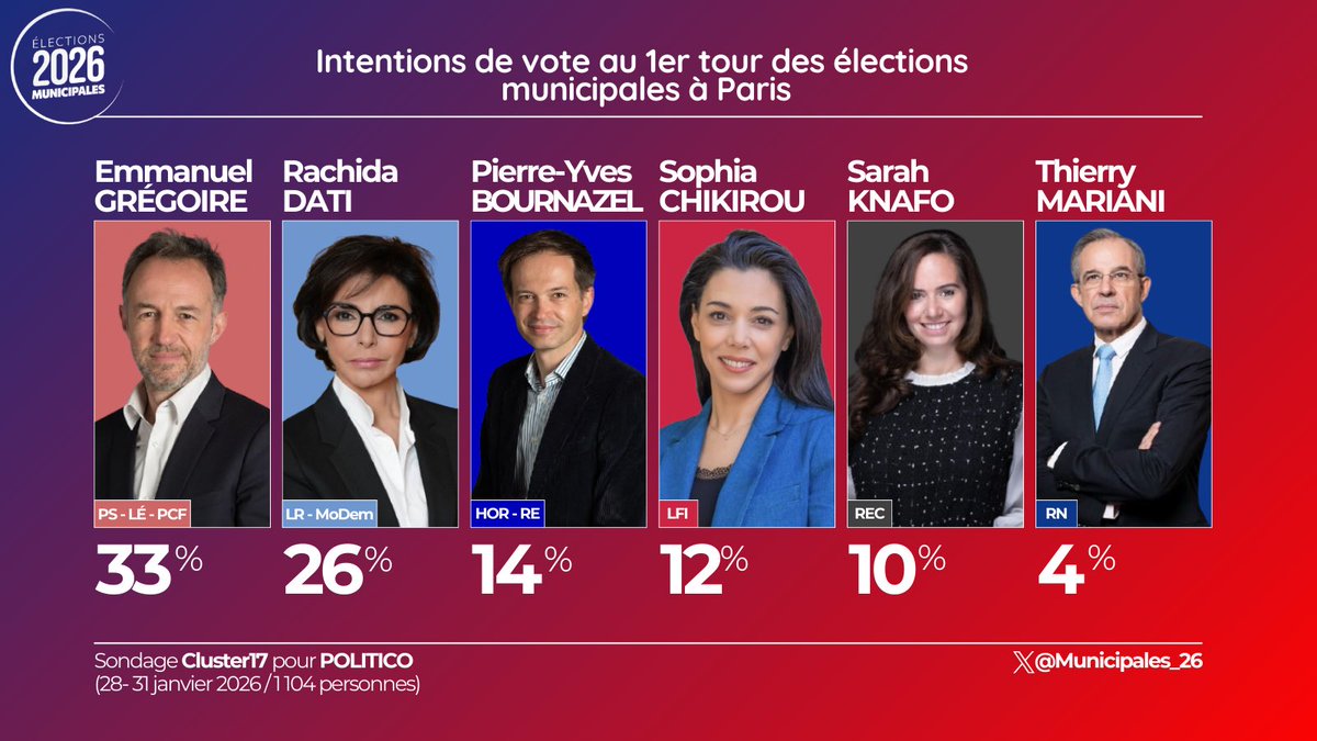 RT by @jylgallou: 🗳️ Intentions de vote Ă  Paris – @Cluster_17 • E. GrĂ©goire (PS-LÉ-PCF) – 33% • R. Dati (LR-MoDem) – 26% • P-Y. Bournazel (HOR-RE) – 14% • S. Chikirou (LFI) – 12% • S. Knafo (REC) – 10% • T. Mariani (RN)