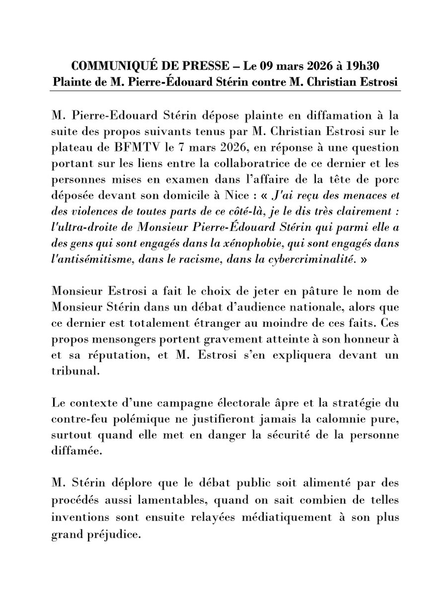 RT by @jylgallou: Communiqué de presse de Pierre-Edouard #Stérin. Plainte en #diffamation contre Christian #Estrosi. pic.