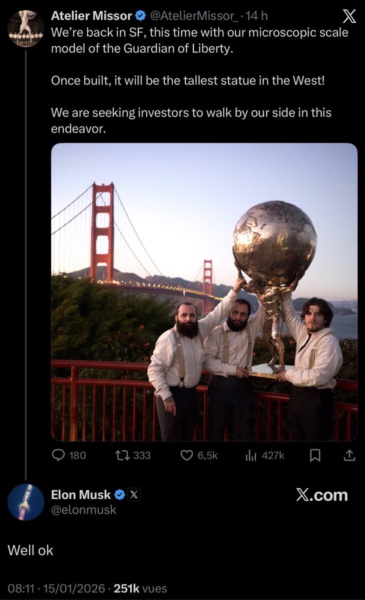 RT by @jylgallou: Elon Musk @elonmusk apporte son soutien au projet de l’atelier de sculpteurs niçois @AtelierMissor_ de réaliser une statue géante d’Atlas. Incroyable ce qu’ils sont en train de faire. Le génie artistique français n’a pas dit son dernier mot. pic.