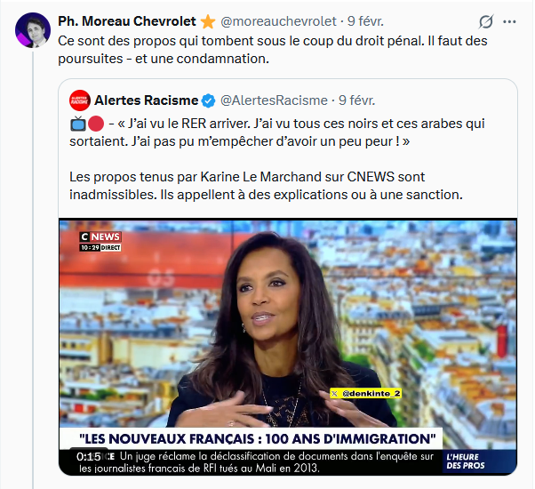 Grotesque extreme-centriste qui décontextualise 15 secondes de propos sur 20 minutes d’interview et pleurera ensuite sur l”hystérisation du débat”. Soutien à Karine Le Marchand victime d’une polémique stérile. pic.twitter.com/mhFG6FgiDv