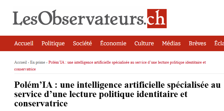 RT by @jylgallou: Polém’IA : une intelligence artificielle spécialisée au service d’une lecture politique identitaire et conservatrice. Merci @ObservateursCH pour cet article fouillé sur notre IA. A découvrir sur Article à lire ici : pic.